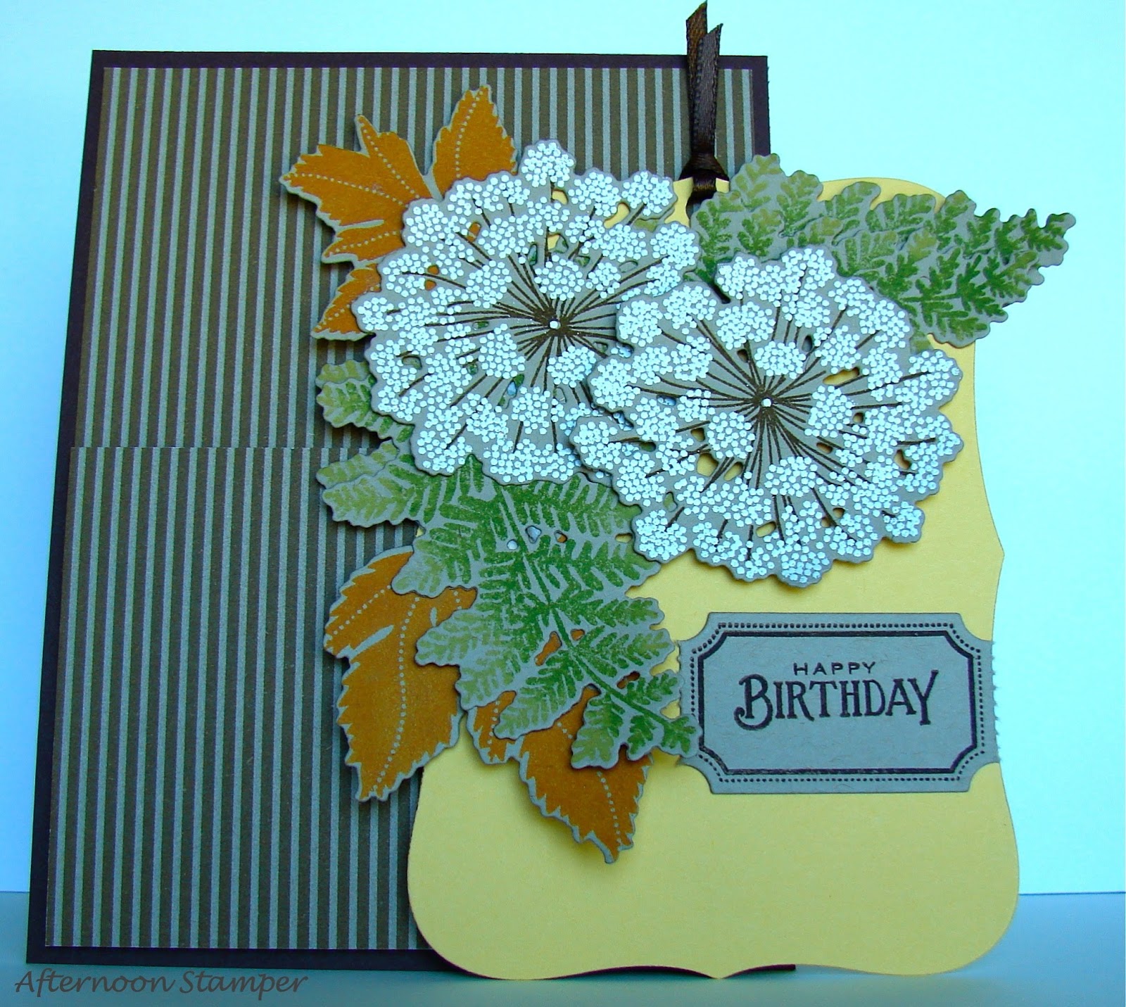 Here is another quick card using the Papertrey Ink Mighty Oak stamp set & coordinating cover plate. Using the cover plate I die cut the paper then stamped the tree trunk in the negative space. Using Walnut Distress Ink I went around the outside of the paper. The leaves were stamped using the different leaf designs in the stamp set. In gold embossing powder I added the Happy Birthday sentiment. It's hard to see and I think I might do something different next time. Also, I stamped it after I popped up all the leaves, so it was a little difficult to get the stamp exactly where I wanted it. Here is my card.
